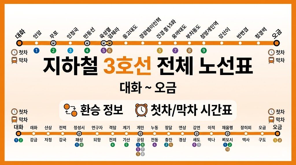 오렌지노선이라고 불리는 지하철 3호선 전체 노선 지하철역과 함께 전체지하철 노선표도 공유합니다. 지하철 3호선(일산선 포함)의 전체 노선도와 주요 역 환승 정보, 그리고 일반적인 첫차 및 막차 시간대를 정리하였습니다. 지하철 3호선 전체 노선도 (대화 ~ 오금) 3호선은 경기도 고양시 대화역에서 서울 송파구 오금역까지 이어지는 핵심 노선입니다. 고양/일산 구간 (일산선)대화 – 주엽 – 정발산 – 마두 – 백석 … 더 읽기