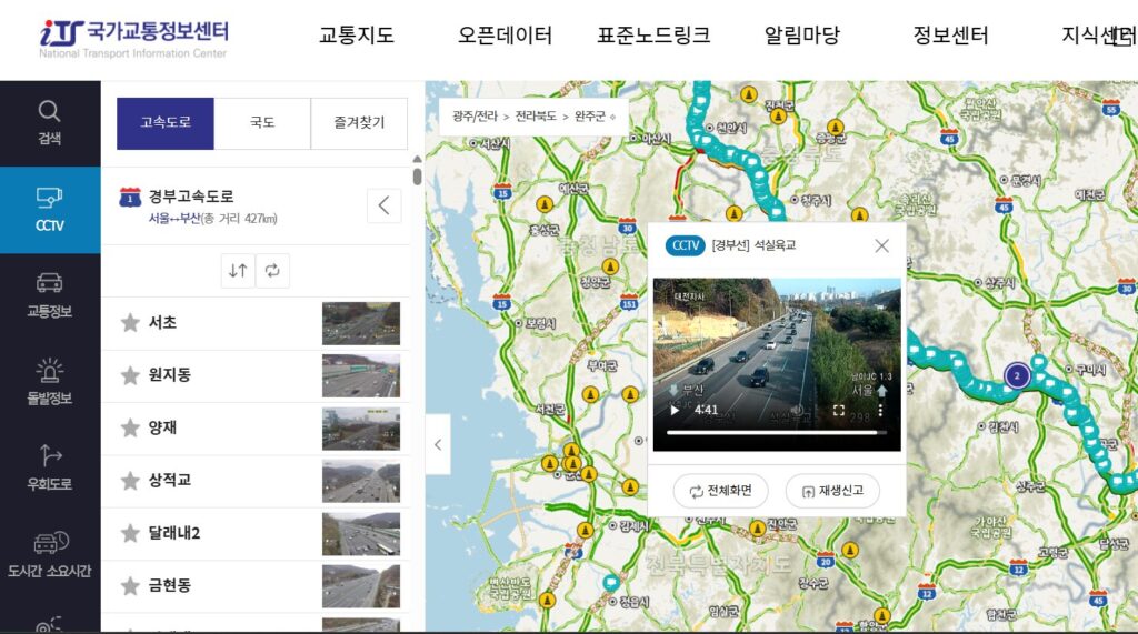 보이시나요? 국가교통정보센터 홈페이지에 방문하면, 전국 곳곳의 주요 고속도로와 국도의 현장 라이브 CCTV 카메라를 볼 수 있습니다.