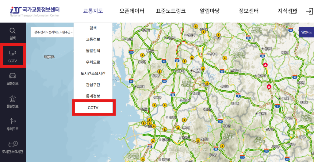 전국 고속도로와 국도의 CCTV 교통상황을 확인하고자 한다면, 국가교통정보센터 사이트 좌측 바로가기나 교통지도 항목에서 ‘CCTV’를 누르시면 됩니다.
