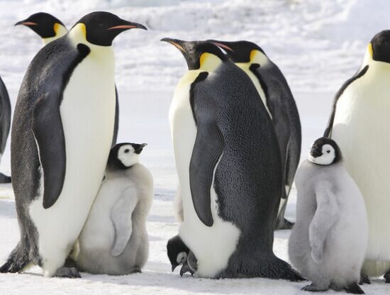 모든 펭귄 중 몸집이 가장 큽니다. 키는 약 110에서 130센티미터에 달하며 남극의 혹독한 추위 속에서 번식합니다.