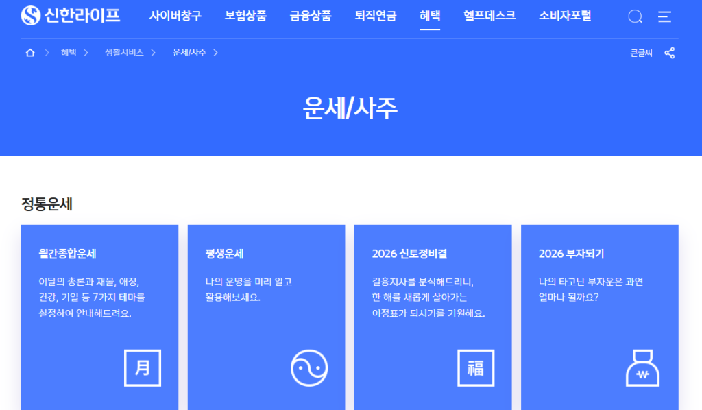 신한생명 라이프 서비스 역시 회원가입 없이 무료로 운세 사주를 볼 수 있는 가장 대표적인 사이트가 아닐까 싶습니다.