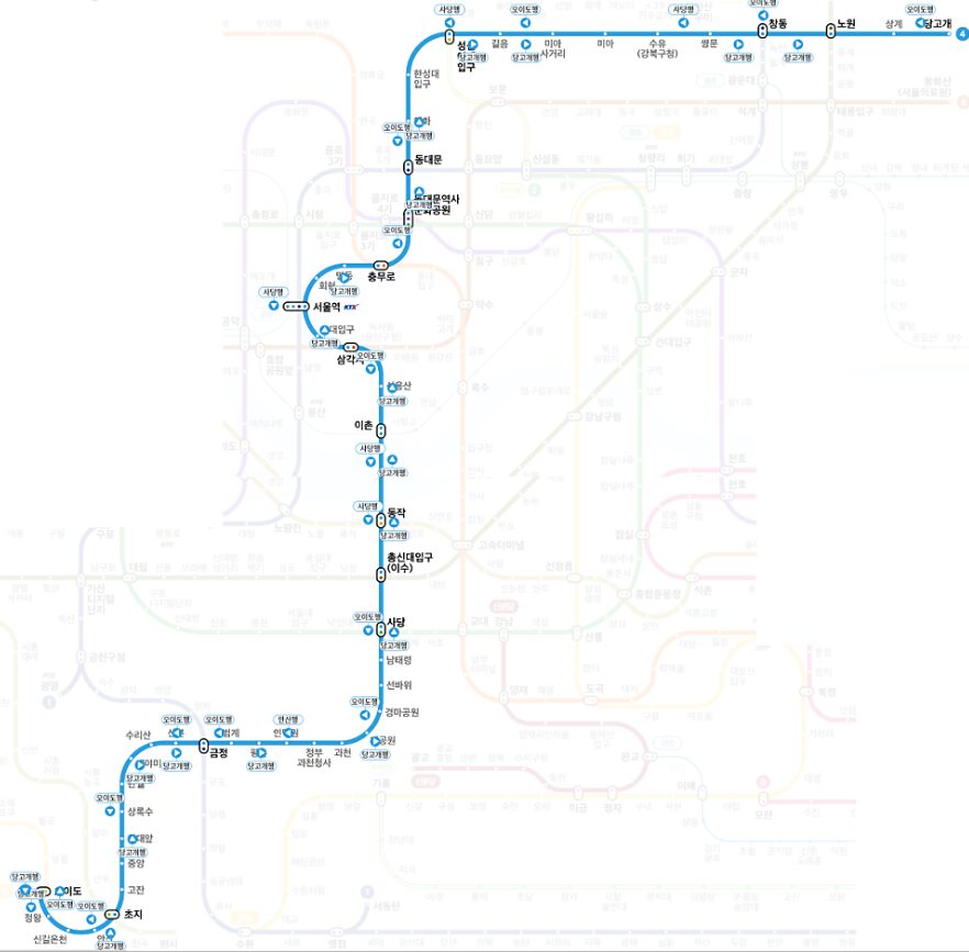 먼저 4호선 전체 노선도을 알아보겠습니다.