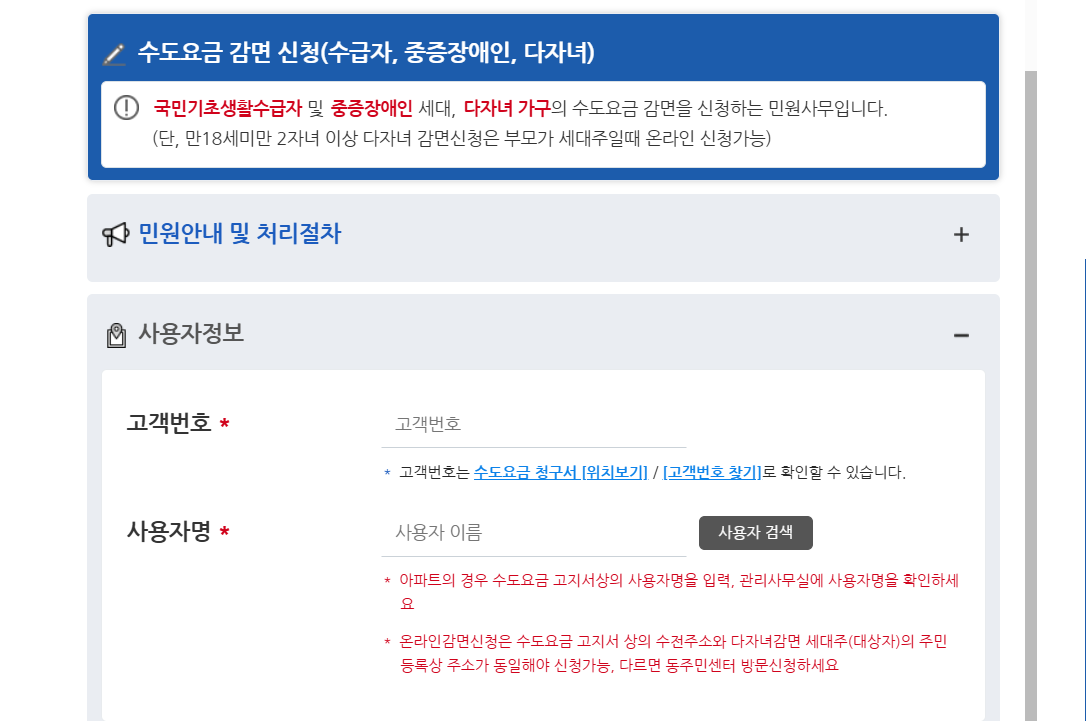 수도요금 감면 신청(다자녀) 카테고리로 잘 들어갔다면, 위와 같은 메뉴가 나옵니다.