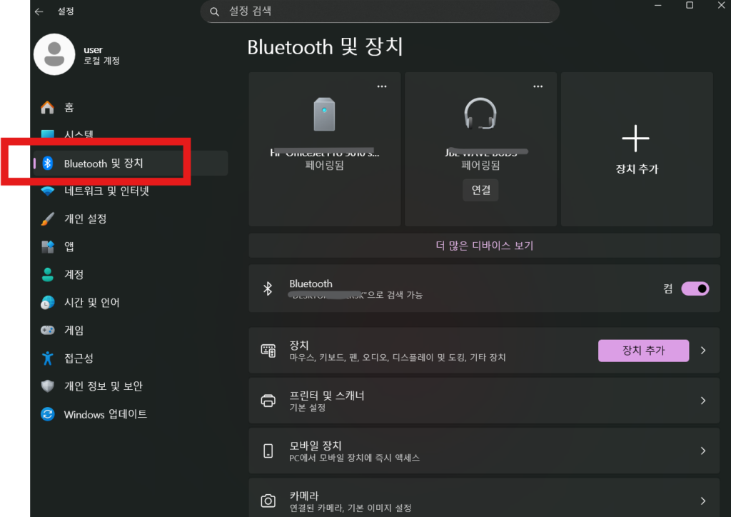 윈도우 설정 메뉴에서 ‘블루투스 및 장치’ 카테고리로 들어갑니다.