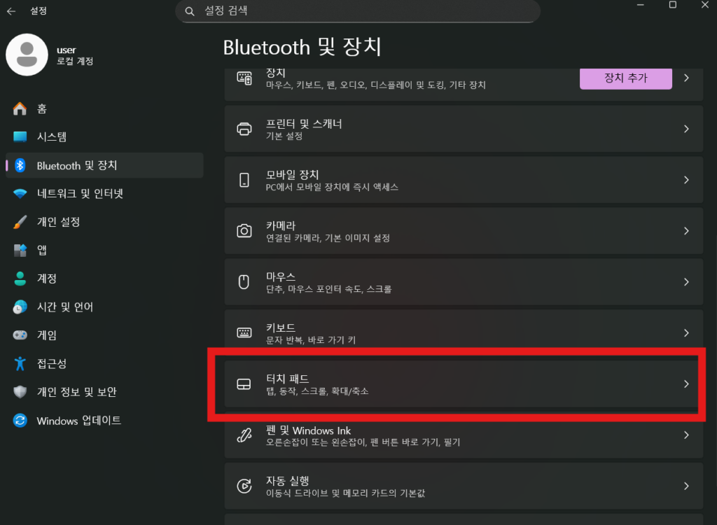 윈도우 설정 – 블루투수및장치로 잘 들어갔다면, ‘터치패드’ 항목을 클릭합니다!
