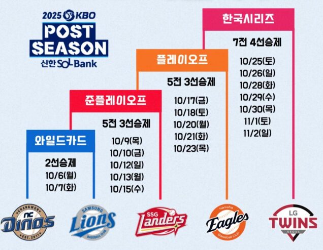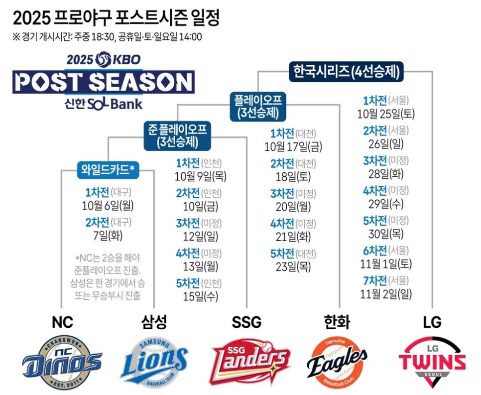 2025 한국프로야구 포스트시즌 진출팀은 총 5팀이다. NC, 삼성, SSG, 한화, LG이다. NC가 와일드카드 결정전에서 탈락하였기 때문에 이제 4팀이 남아있는 상황이다.
