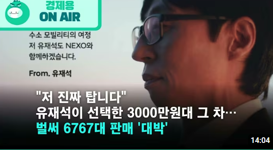 이산화탄소 없이 떠나는 수소 모빌리티의 여정을 유재석도 함께 한다고 자동차 광고하는 NEXO(넥소).