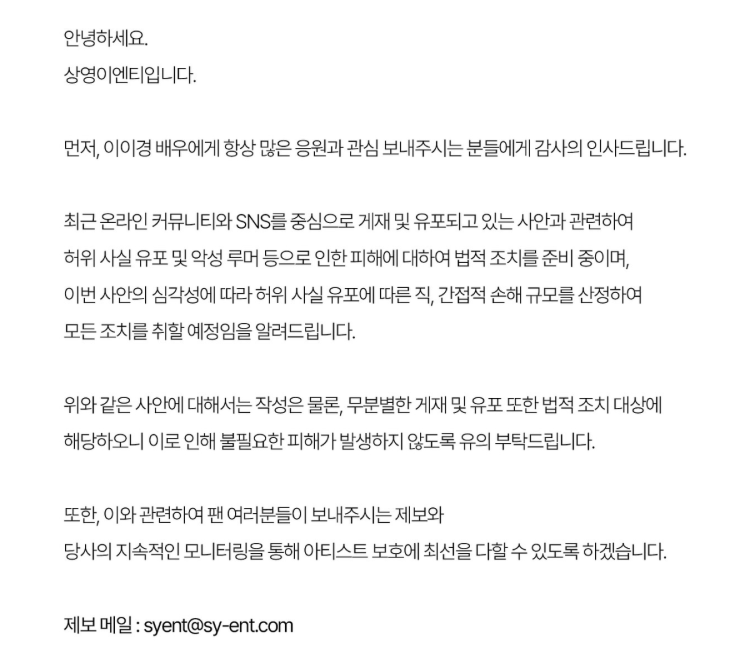 이이경 소속사의 공식 입장 발표 자료입니다. 이번 사건을 무분별한 게재 및 유포로 판단하였고, 강력한 법적 조치로 대응하겠다는 입장입니다.