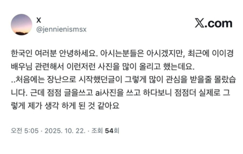 누구의 말이 사실일까요. 챗지피티다 제미나이다 하면서 AI시대로 급변하고 있는 현재 시점에서 AI조작 관련 사건으로 조명받고 있는 이이경사건의 전말이 정확히 밝혀져서 거짓말을 하고 있는 일방에 대한 엄격한 법적 사회적 조치가 취해지길 바랍니다.