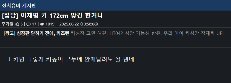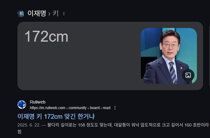 위 사진에서 바로 아래의 글을 보면 ‘이재명 키 172 맞긴 한거냐?’라는 글이 최상단 관련 게시글로 올라와 있다.