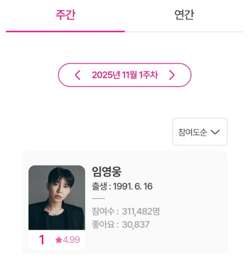 아이돌차트에 따르면 임영웅은 11월 3일부터 9일까지 집계된 2025년 11월 1주차 평점랭킹에서 계속 1위를 기록하고 있다.